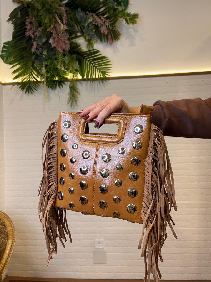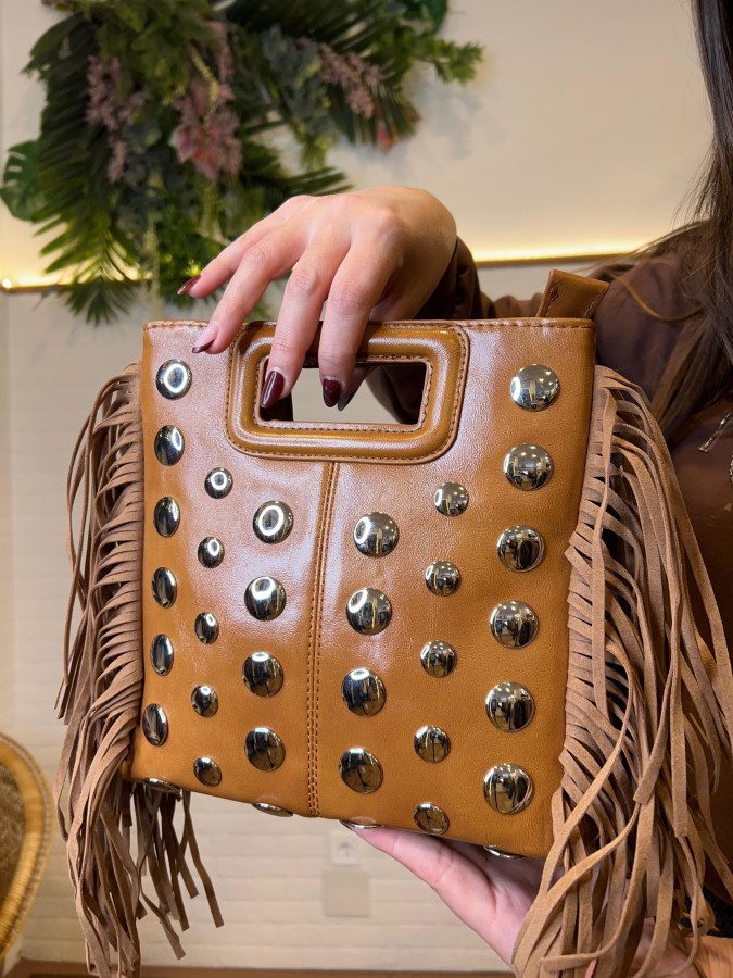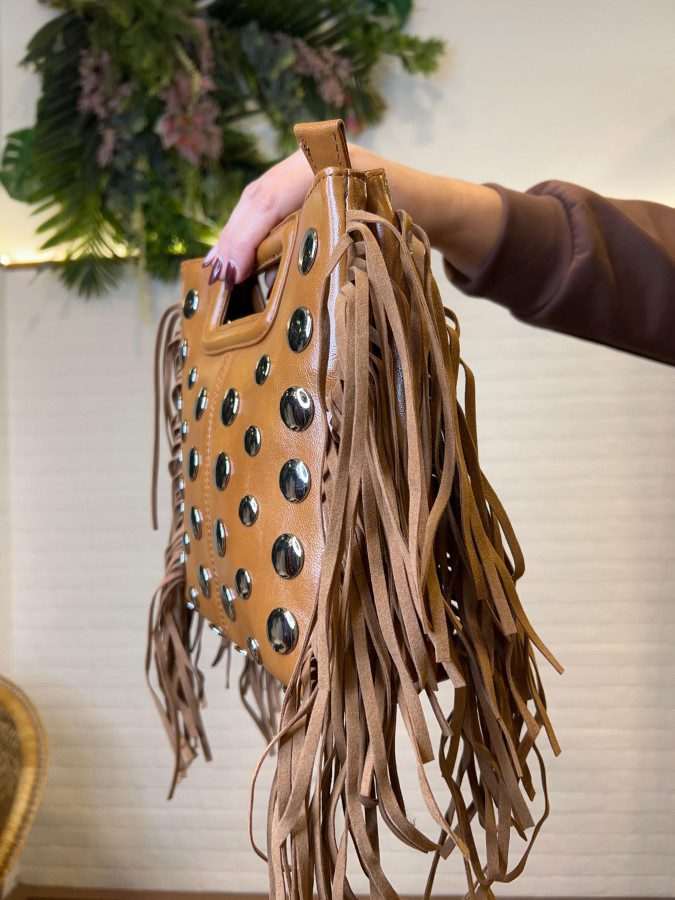 Bolso bandolera en color camel con detalles de tachuelas y flecos.