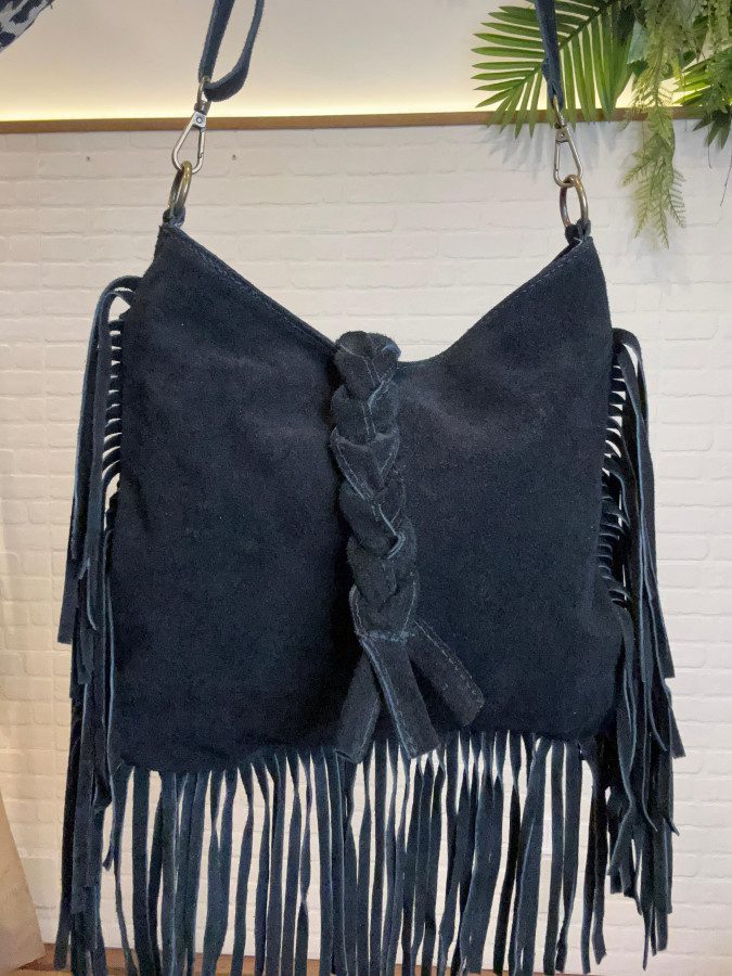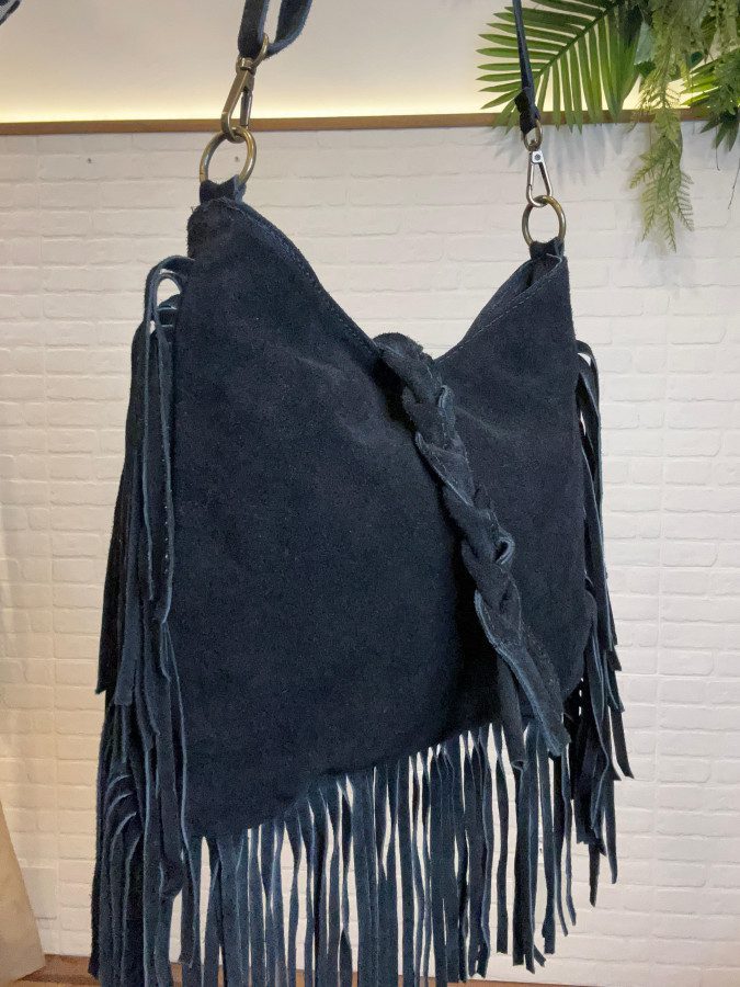 Bolso bandolera negro en ante con detalle de flecos.