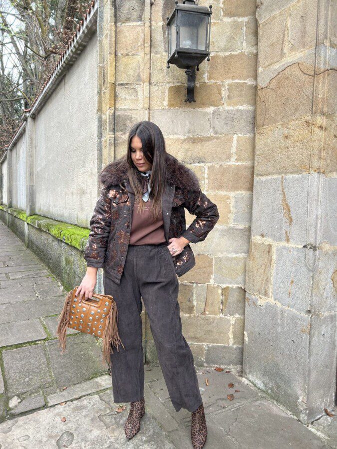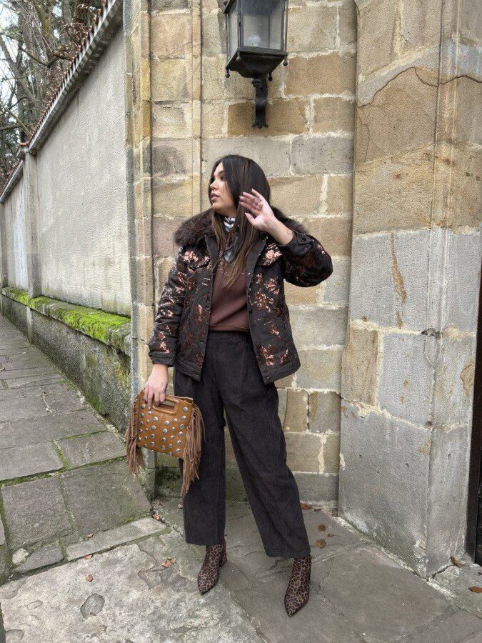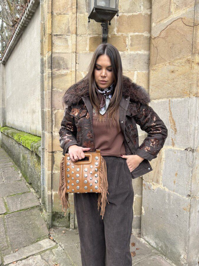 Bomber en tejido denim en color chocolate con cuello de pelo desmontable.
