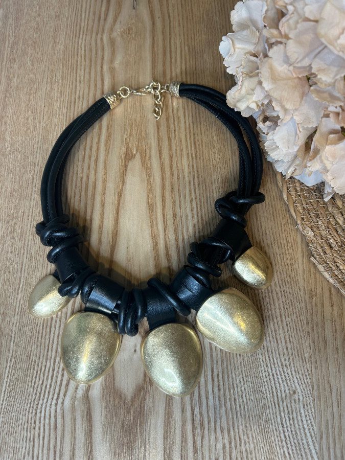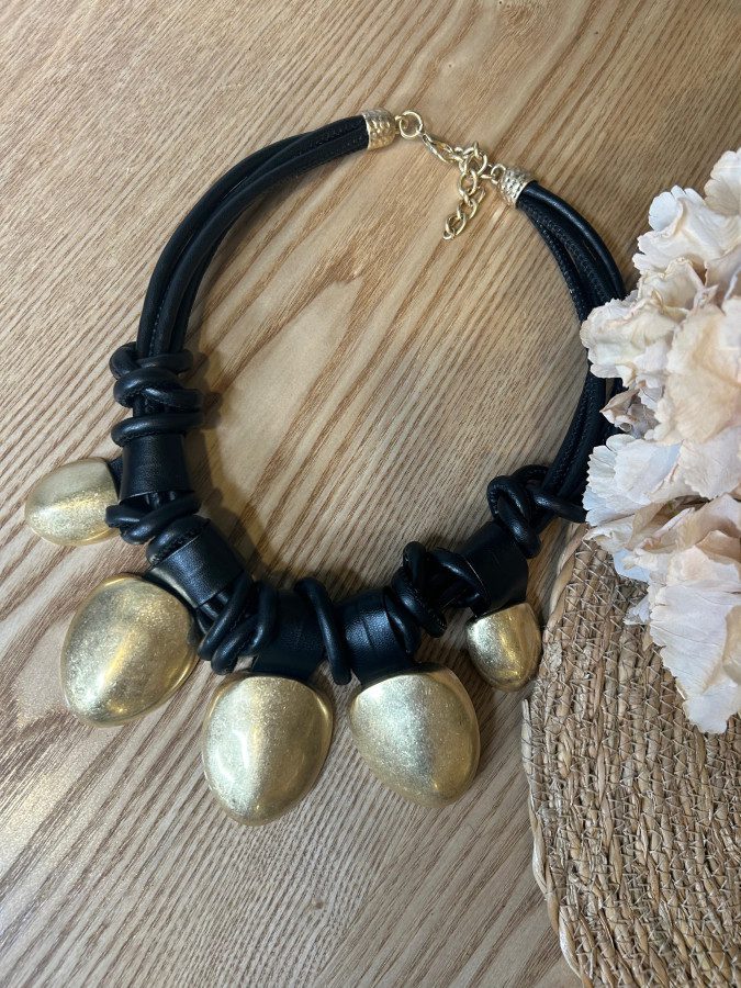 Collar de cuero negro con detalles en dorado.